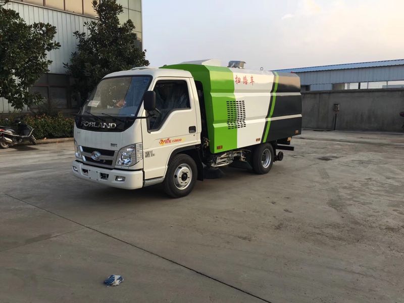 該掃路車采用福田小卡型二類底盤改裝,加裝副發(fā)動(dòng)機(jī)、風(fēng)機(jī)、清水箱、垃圾箱、左右立掃、后置吸盤,掃盤降塵系統(tǒng),液壓系統(tǒng)、專用裝置電控系統(tǒng)和副車架等改裝而成。