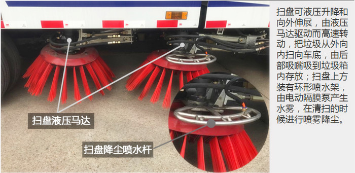 8.駕駛室電液集中控制,操作方便;掃盤有防碰撞 自動避讓功能,可根據(jù)地面泥沙嚴(yán)重程度及行車速度選擇掃盤的清掃方式;吸嘴為后置浮動式,可自動調(diào)節(jié)適應(yīng)地面凹凸不平的狀況;可調(diào)節(jié)的霧狀噴灑水壓塵,在節(jié)水的同時消除二次污染。