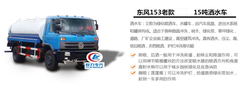 東風153-15噸綠化噴灑車,環衛車專用底盤,153經典車身,整車通過性強,底盤扎實耐用,輪胎大!度量大,國五電噴190馬力康明斯發動機,性能優良,外觀簡單經典,發動機節能環保,維護費用低。道路灑水,工地灑水的不二之選!