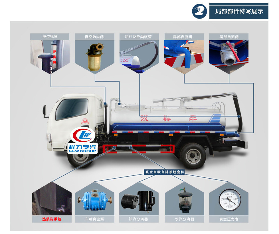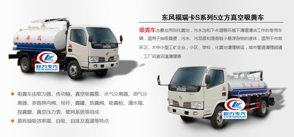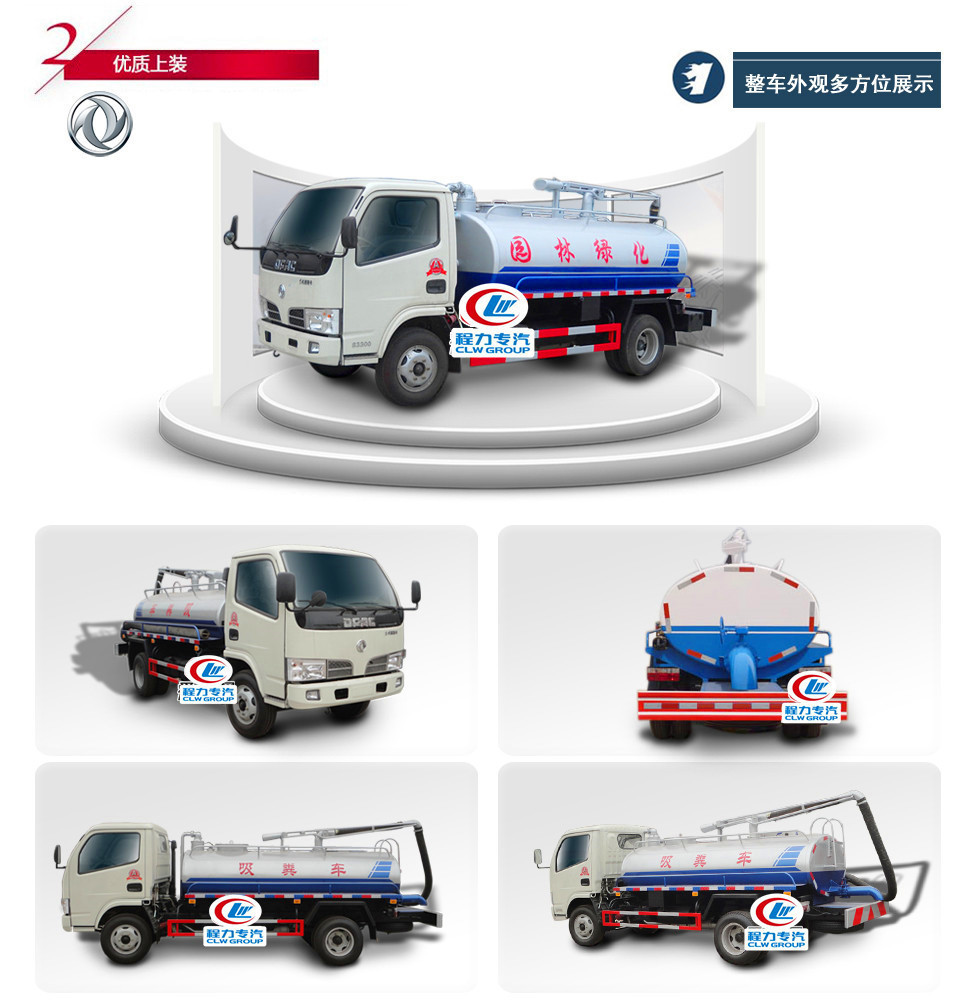 國五東風多利卡吸糞車罐體采用機器壓板一次性成型技術,采用先進旋邊機,罐體包罐機工藝保證了罐體制作的精度和美觀。全國獨有烤漆工藝,防腐除銹,多層底漆、面漆噴涂。主要為城鄉環衛部門抽吸和運送糞便及其它污水。適用于抽吸糞便,污水、污泥漿和混有較小懸浮雜物的液體,適用于市政環衛、大中小型工礦企業,小區、學校,化糞池清理轉運,城市管道清理疏通,工廠沼液沼渣清理等。